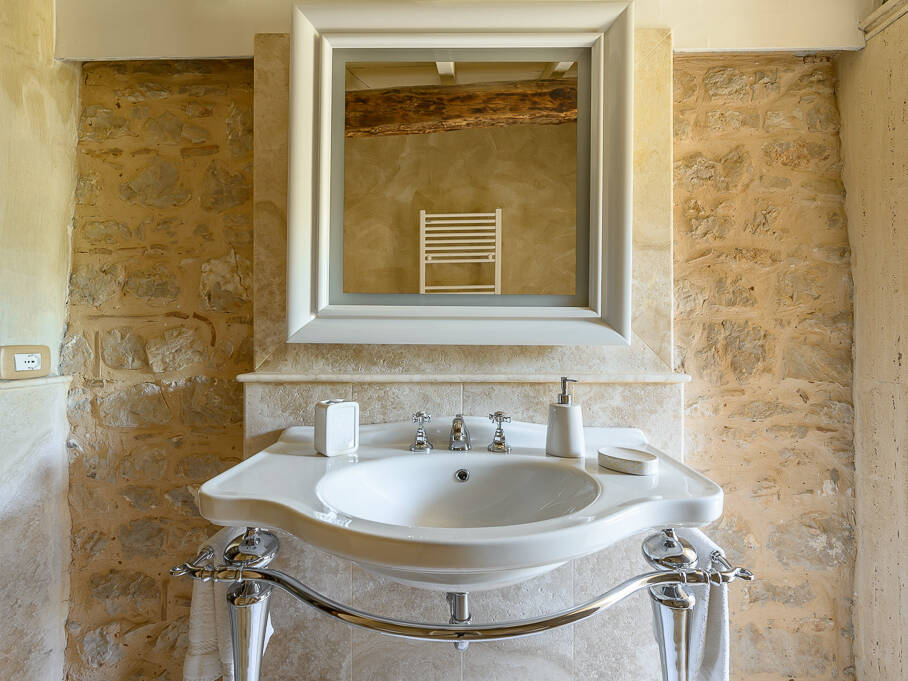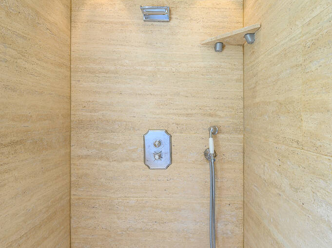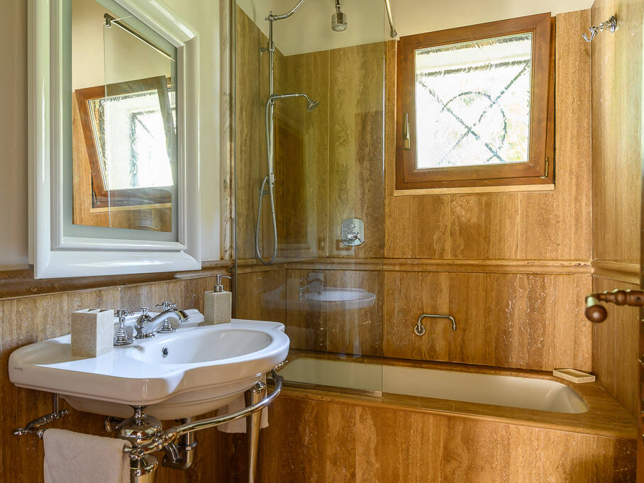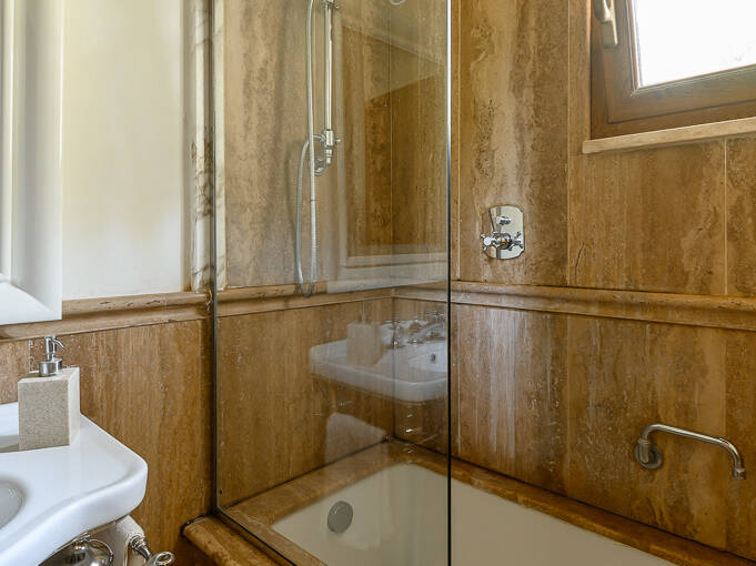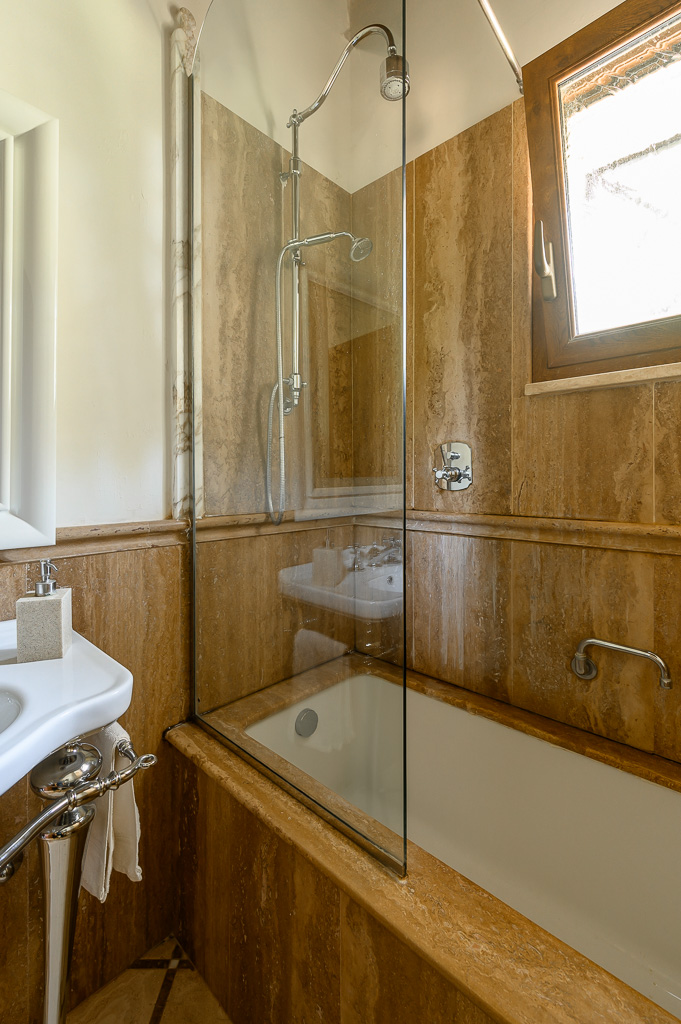 There are three full bathrooms in the villa. The 1st floor bathroom is off the living room/dining room area. When unlocked, you may also enter from outside when using the pool. This is a full bath with a walk-in shower. The 2nd floor bathroom is a combination tub/shower and has a bidet. It is shared by the queen room and twin room on the 2nd floor. The 3rd floor bathroom has a walk-in Travertine spa shower with a rain shower head and cascading faucet. There is also a handheld shower. This bathroom has a bidet. The stone for the bathrooms was chosen from the famous town of Tivoli, near Rome.