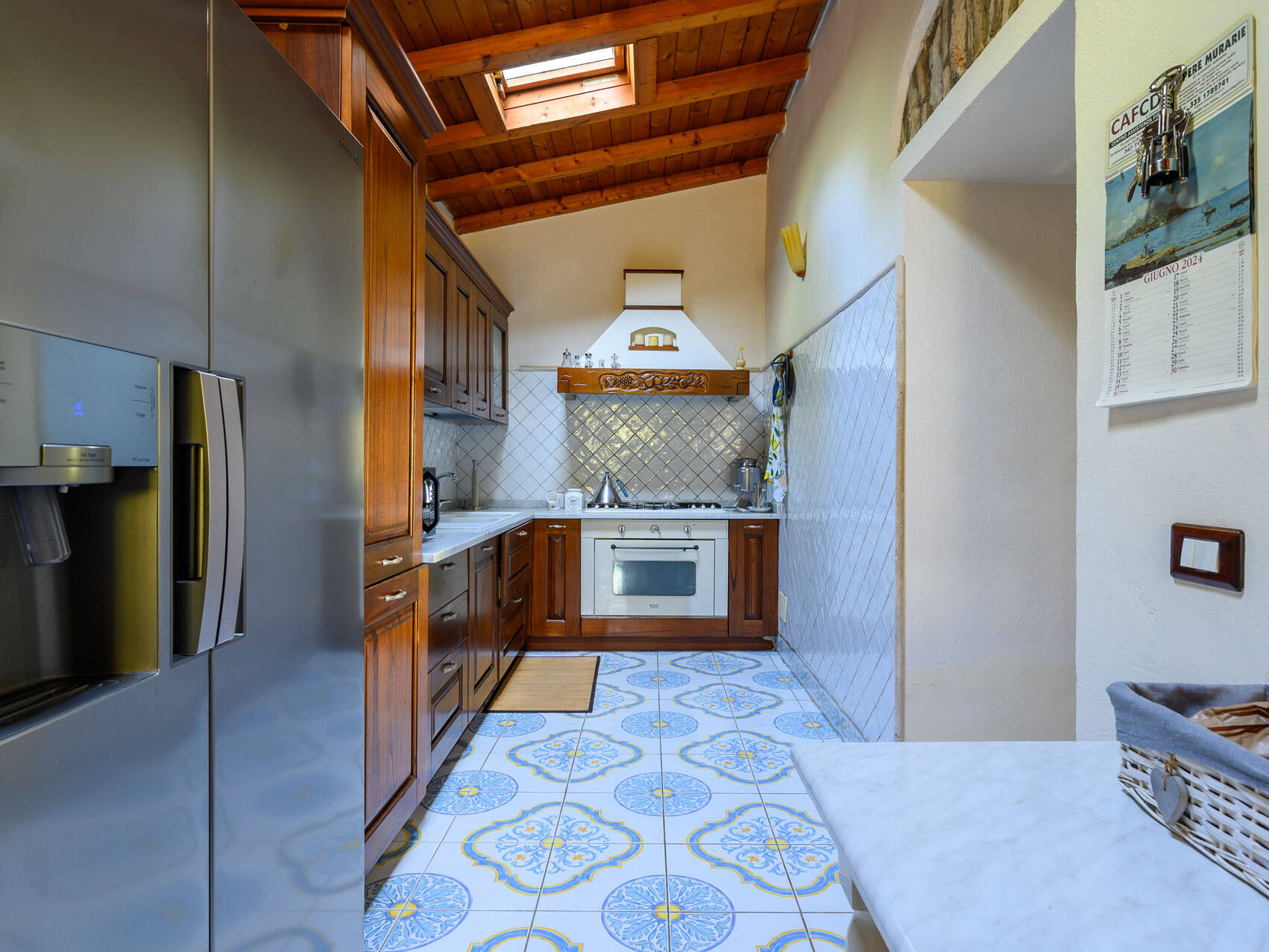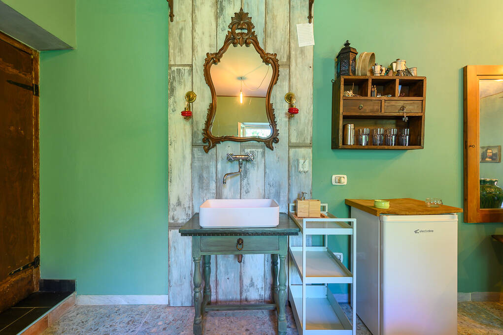 Our renovated kitchen features colorful Italian tile flooring and white Carrara marble countertops. The kitchen is equipped with modern appliances, including a stainless steel refrigerator, dishwasher, and gas stove. We provide Calphalon cookware and all the dishware/cooking instruments needed for a 5-course Italian meal. Local grocers offer the ingredients for a wonderful meal, or you can have one prepared by emailing us at villaditrapano@gmail.com when you reserve the Villa.